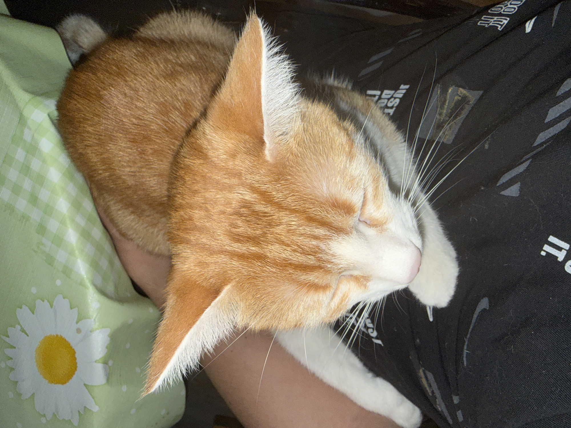 An orange and white tabby cat is depicted resting on a person's lap, viewed from a high angle
