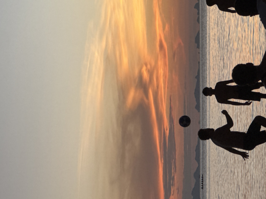 The image displays a sunset scene over a body of water in Baan Sri Thanu, Thailand. Four human figures are silhouetted against a sky exhibiting vibrant orange, red, and yellow hues, fading to lighter orange and pale blue overhead. In the left-center, two figures are actively engaged in playing a sport with a dark, spherical ball, which is suspended in mid-air. One figure is captured with a raised leg, positioned as if kicking or heading the ball, while another stands nearby. Two additional figures are partially visible on the right and bottom-right. All visible figures appear shirtless and wear shorts. The water surface reflects the sky's warm colors. In the distance, a chain of dark, low-lying islands or landmasses is visible on the horizon, with a long, narrow boat containing multiple occupants silhouetted on the water to the far left.