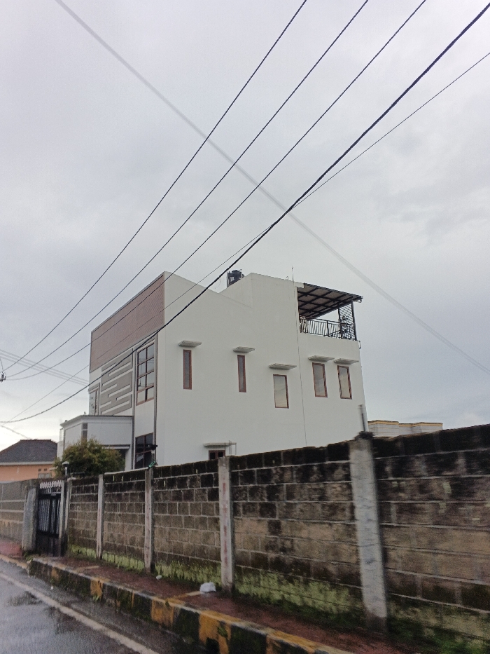 A multi-story building stands behind a weathered brick and concrete wall. The building features a modern design with white exterior walls, rectangular windows with dark frames, and a partially shaded rooftop terrace. Power lines stretch across the cloudy sky. A hint of greenery is seen to the left of the building, partially obscuring another house. The sidewalk in the foreground appears wet.