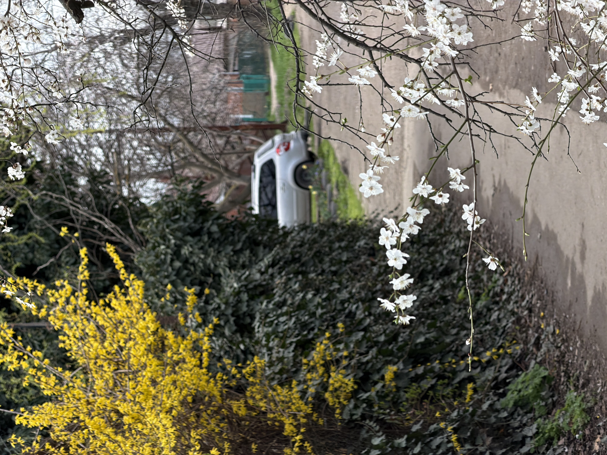 The image depicts an outdoor scene with a sidewalk on the right, partially obscured by flowering branches with white blossoms. A vibrant yellow bush is on the left side of the frame, and a dense green hedge is in the background. A light-colored car is visible further down the sidewalk, framed by trees. The scene appears to be a residential area during the spring. The city name is not indicated by any details visible in the photo.