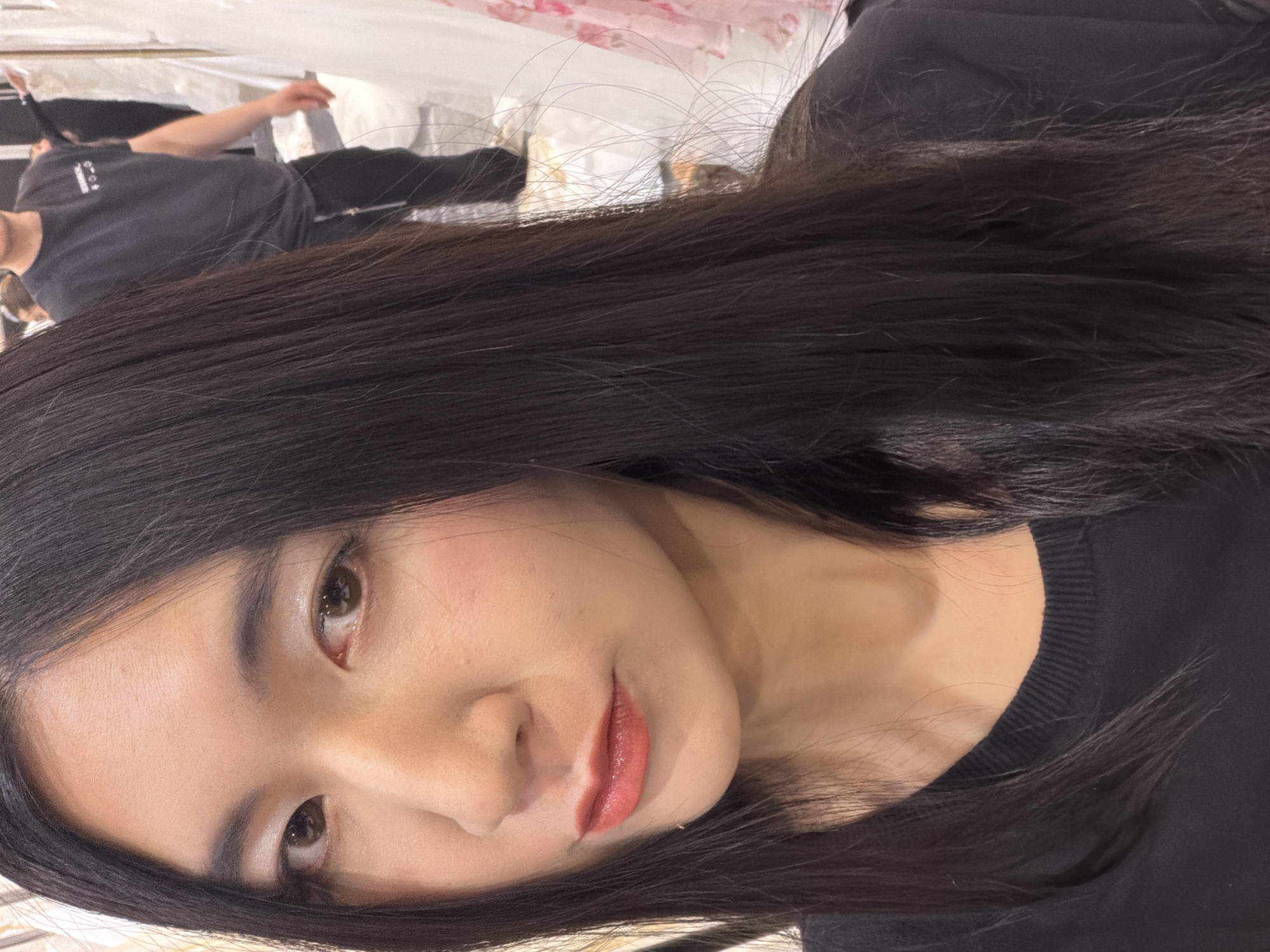 An indoor scene in Essen, Germany, depicts a close-up portrait of an adult female of East Asian ethnicity. She occupies the foreground, looking directly at the camera with a neutral expression. Her long, straight, dark brown hair cascades over both shoulders, partially obscuring the background. She wears a black ribbed crew-neck long-sleeved top. Her facial features include dark brown eyes with light shimmering eyeshadow, dark eyebrows, subtle blush on the cheeks, and reddish-orange lipstick. In the blurred background, an adult male is partially visible behind the primary subject's left shoulder. He has short dark hair and wears a dark grey short-sleeved t-shirt with "BEDROCK" printed on the chest, paired with dark trousers. Numerous light-colored garments, appearing to be dresses or gowns, are visible on racks or mannequins, indicating a retail or event environment for apparel. The lighting is consistent with an indoor artificial source. No direct interaction between the individuals is apparent.
