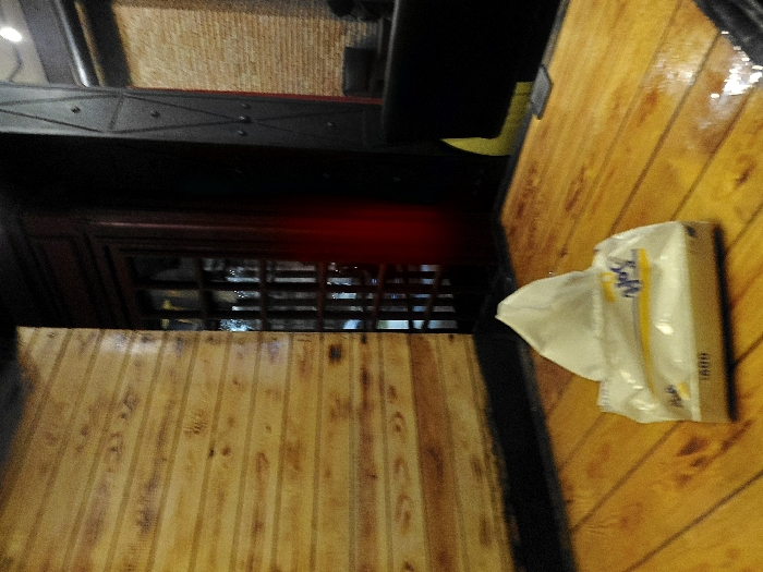 A box of facial tissues sits on a wood-grain table in a restaurant. The table is adjacent to a dark, varnished wooden wall that has vertical panels, and a black support beam overhead. Behind the support beam, there is a window. The walls and ceiling are out of focus.