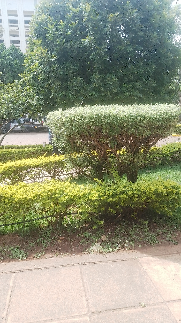 A view of neatly trimmed hedges in a tiered garden arrangement. Lush green foliage dominates, with a taller tree in the background and a building visible above. A paved area with square stones forms the foreground, leading to the landscaped greenery. A couple of cars are vaguely visible behind the vegetation. The overall scene is an outdoor setting of a well-maintained garden or park.
