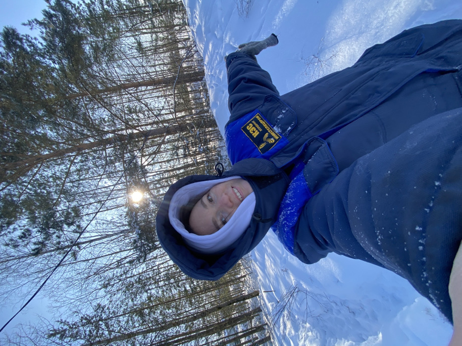 A single individual, appearing female, is depicted in a selfie photograph taken outdoors in a snowy, forested environment