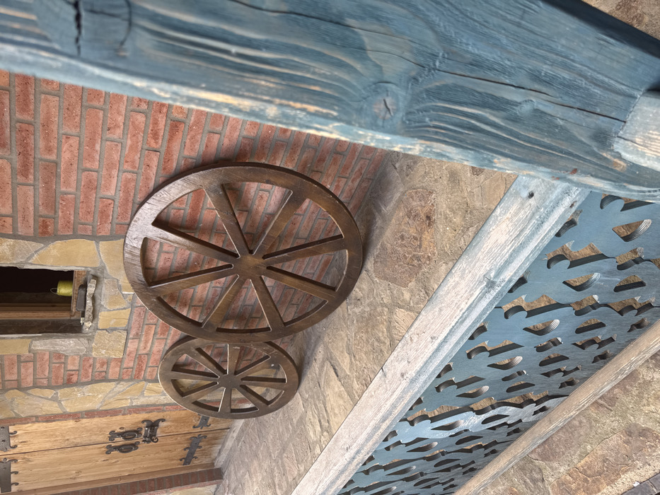 - "An outdoor scene in Velebi, Georgia, captured at eye-level, features two decorative wooden wagon wheels leaning against a building facade" by FM-EU4xB3, licensed under CC BY 4.0