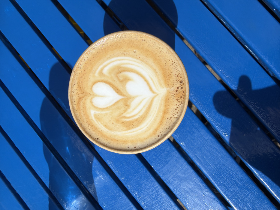 - "An overhead view captures a single, light-brown paper coffee cup containing a latte with intricate white and tan foam art, depicting two stacked heart or tulip-like patterns" by FM-R7RZz2, licensed under CC BY 4.0