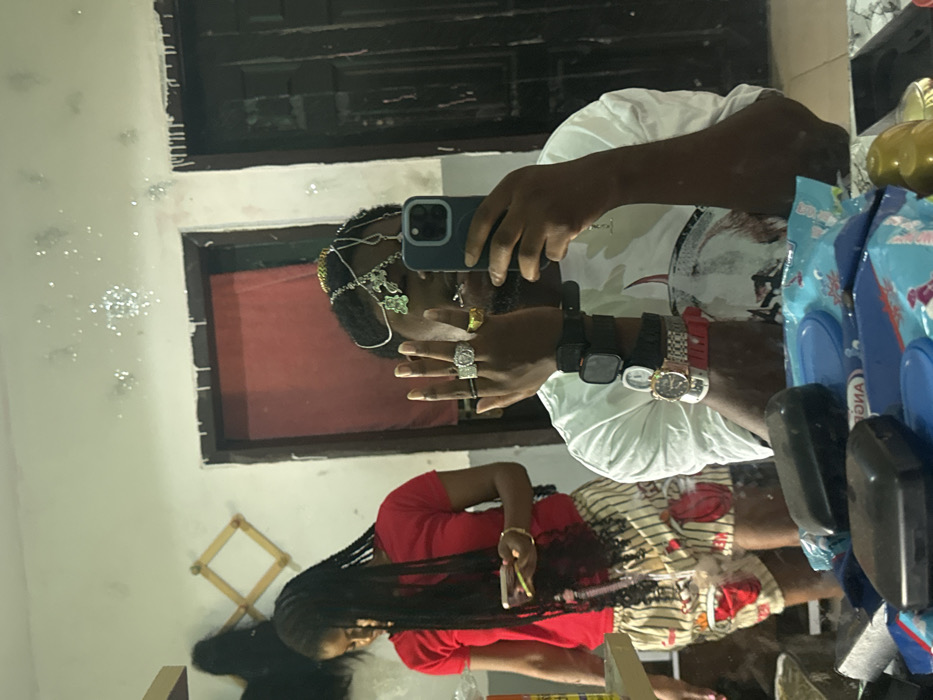 This image, captured in Asipa, Nigeria, depicts an indoor scene primarily through a mirror reflection. In the foreground, a person is taking a selfie, obscuring their face with a dark blue smartphone held in their right hand. This individual wears a white short-sleeved t-shirt with a graphic design and is heavily accessorized: multiple rings adorn their fingers, including a large silver-colored ring on the index finger and a gold-colored ring on the ring finger. Several watches and smartwatches are stacked on their left forearm. A decorative headpiece with green bear-shaped charms and other embellishments is visible around their head. Reflected in the background, a second individual, identified as female, stands looking down at a white smartphone held in her left hand. She wears a red short-sleeved t-shirt and light-colored shorts with a red and white pattern, possibly featuring the Chicago Bulls logo. Her long, dark hair is styled in braids. The immediate foreground, on the surface of the mirror, shows several objects: dark-colored rectangular containers, a blue package of wipes (brand "ANCE" reversed), and a golden object. The room's environment consists of light-colored walls with visible wear and speckling. Two dark wooden doorframes are present in the background, one with a red curtain behind it. A light-colored wooden rack or shelf is mounted on the left wall, with dark material (possibly hair extensions) hanging from it.