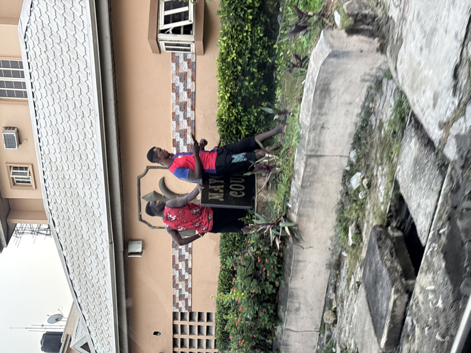 Two men stand beside a sign reading "May Court" in front of a tan building. The man closest to the sign wears a red floral shirt and dark pants. The other man wears a red and blue shirt with dark shorts. Behind them is a hedge, and to the left, the side of the building with windows and an air conditioner. To the right is a concrete drainage system.