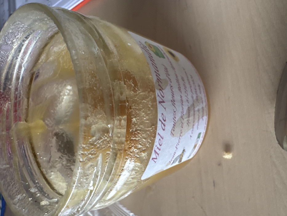 A clear glass jar, partially consumed, containing viscous yellow-amber honey, is centered in the frame. A utensil, likely a spoon, is partially visible submerged in the honey. The interior walls of the jar exhibit dried honey residue, indicating prior use. A white label on the front of the jar reads "Miel de Normandie" (Honey from Normandy) at the top, followed by "Toutes fleurs d'été" (All summer flowers). Below this, the producers are identified as "Jean-Pierre et Florian Belleau apiculteur," with the location "Houx 61210 Rânes," identifying Rânes, France, as the origin of the honey. The jar rests on a light-colored, possibly wooden, surface. A small, light-colored crumb or debris is visible on the surface near the base of the jar. No individuals are present. The precise location of this photograph within the city of Caen, France, cannot be determined from the visual evidence provided.