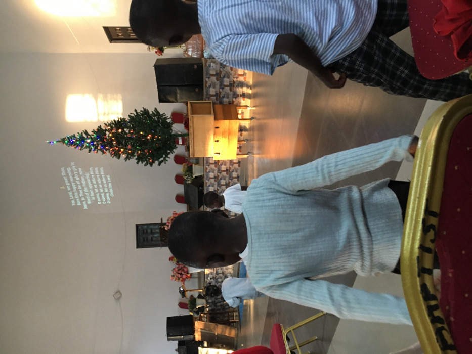 The interior shows a festive setting, likely a church, with a Christmas tree adorned with lights. Text projected on the wall displays hymn lyrics. Several people are present, including two children wearing striped shirts, with one closer to the foreground and one further away. The scene is from an elevated perspective, showcasing the interior's arrangement and the congregation.