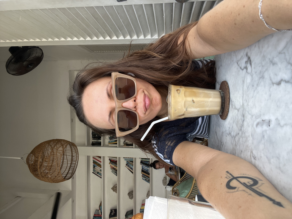 An individual takes a selfie indoors at a café in Canggu, Indonesia