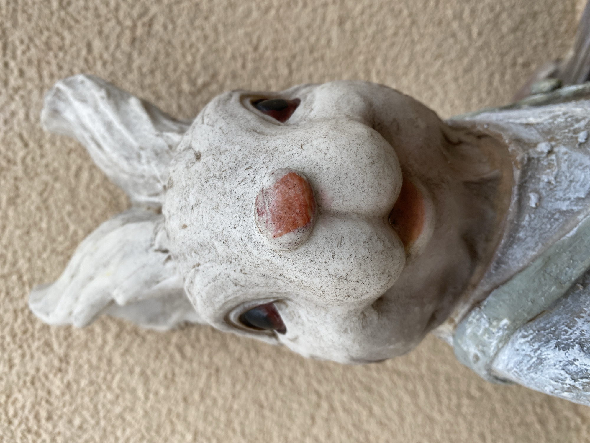 A weathered white rabbit statue is depicted in a close-up, head-on view against a textured, light brown stucco wall