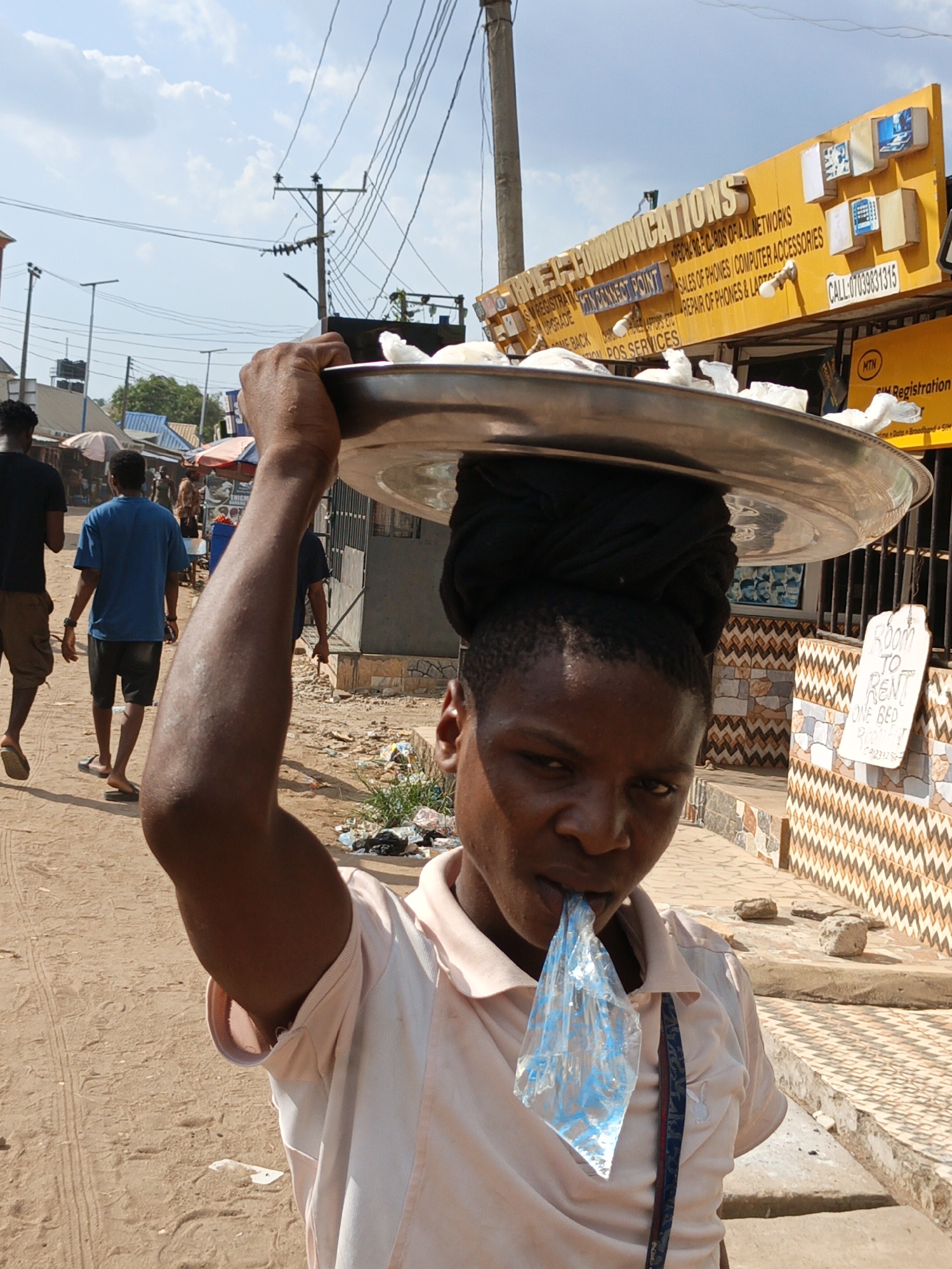 This image depicts a bustling street scene in Malessama, Chad, under a light blue sky with scattered white clouds. In the immediate foreground, a person with dark skin, wearing a light-colored, short-sleeved collared shirt, holds a large, round, silver-colored metal tray on their head with their raised right arm. A black headwrap is visible between the tray and the person's head. The tray contains numerous small, white, irregularly shaped objects, likely food items wrapped in paper or plastic. The individual is drinking from a clear plastic sachet containing a blue-tinted liquid, which is held in their mouth. Behind the foreground subject, a dirt road extends into the distance. Two men walk away from the camera on this road: one in a dark t-shirt and light brown shorts, and another in a blue t-shirt and dark shorts. Both wear flip-flops. The road surface is dry, light brown dirt with tire tracks and footprints. Litter, including plastic bags, is visible along the side of the road. On the right side of the image, a building features a distinct facade composed of brown, beige, white, and black geometric patterned tiles, with a metal security gate. A white sign attached to this building advertises "ROOM TO RENT ONE BED ROOM" with a contact number (C223326-). Above this, a large yellow sign with raised lettering identifies "RHEC-COMMUNICATIONS," advertising "RECHARGE CARDS OF ALL NETWORKS," "SALES OF PHONES / COMPUTER ACCESSORIES," "REPAIR OF PHONES & LAPTOP," "SM REGISTRATION," and "POS SERVICES," along with a contact number (CALL: 07039831315). A partial "MTN SIM Registration" sign is visible below the yellow sign. Overhead, multiple utility poles support a dense network of electrical wires, and two streetlights are visible. In the further background, additional buildings and market stalls with open umbrellas are discernible.