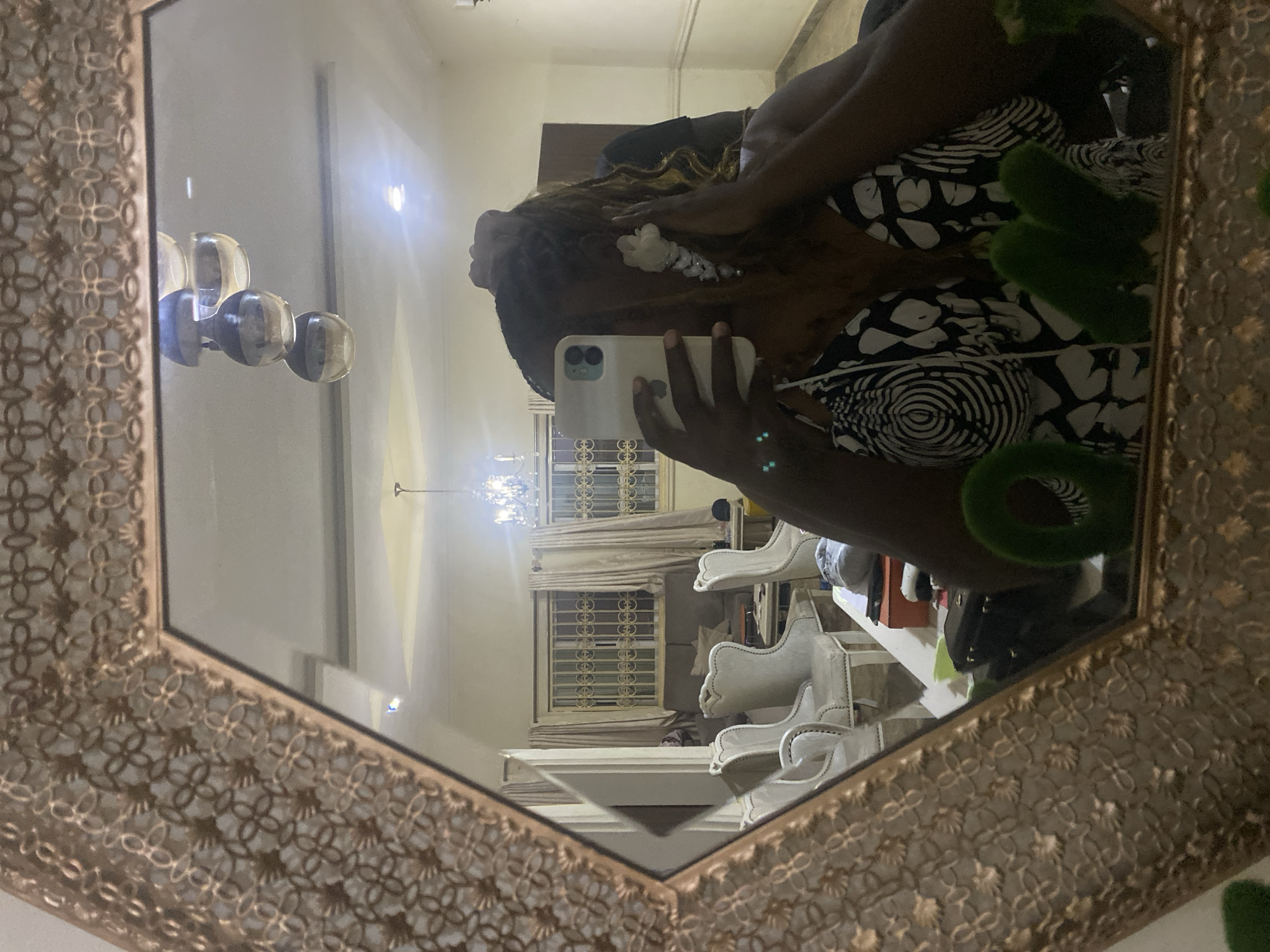 A person is taking a selfie in a mirror. The reflection in the mirror shows a room with a chandelier, windows with blinds and curtains, and white furniture. The person is holding a white smartphone. The mirror has an ornate, golden frame. The location is unknown and cannot be determined from the image. The city of Barden Yana, Nigeria cannot be validated by this image.