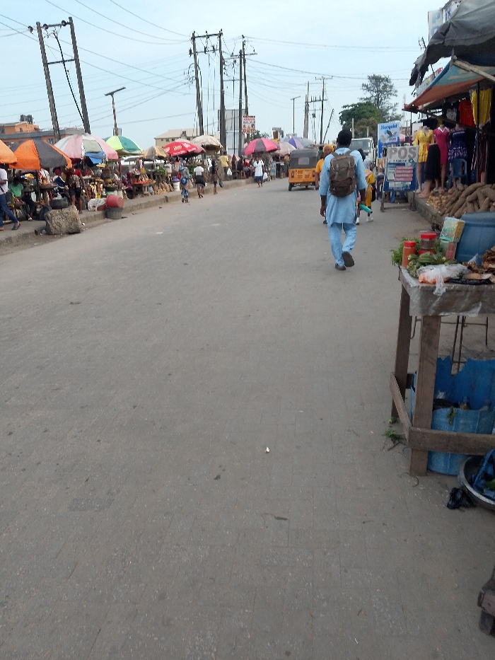 The scene depicts a bustling urban market street in Lagos, Nigeria, under an overcast sky. A paved, two-lane road occupies the center, showing signs of wear and minor debris. In the foreground, a wooden market stall stands on the right, displaying vegetables, small containers with red lids, and what appears to be dried foodstuffs. A blue plastic drum and a metal basin are located beneath the stall. In the midground, a lone male figure, wearing a light blue tunic and trousers with a brown backpack, walks away from the viewer in the center of the road. Further down, a yellow and black tricycle (keke) is visible. Both sides of the street are lined with numerous market stalls. On the left, vendors operate under various colored umbrellas (orange, pink, light blue, red, green), selling an assortment of goods displayed on tables and the ground. Multiple individuals are visible engaging in commercial activities or moving through the market. On the right, another stall displays clothing on mannequins and stacks of large tubers, likely yams or cassava. A white truck is partially visible further down the right side. The background features low-rise buildings and a dense network of utility poles carrying numerous overhead electrical wires, characteristic of urban infrastructure.