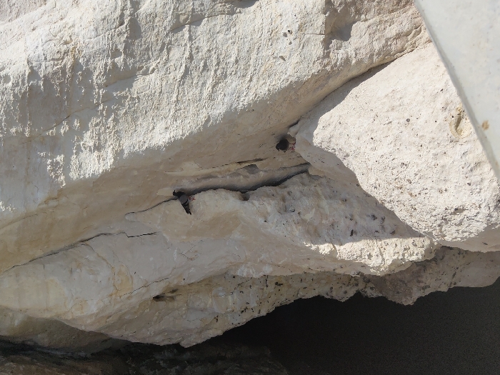 This image depicts a section of a light-colored, weathered rock cliff, consistent with the geological formations found at the Rosh HaNikra Grottoes within the Mate Asher Regional Council, Israel