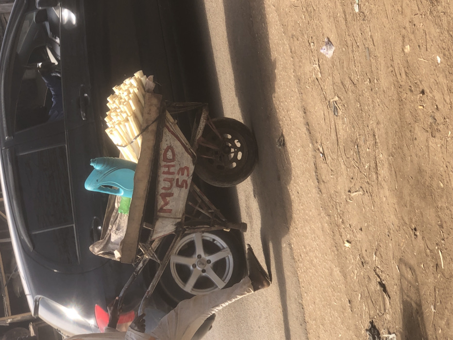 A male individual, partially visible from the waist down, wearing light-colored trousers and dark pointed-toe shoes, is actively pushing a rustic, two-wheeled handcart. The handcart, constructed with a metal frame and a wooden bed, bears the inscription "MUHO 53" in red paint on its visible side. The cart contains a large bundle of approximately 30-40 peeled sugarcane stalks, a light blue plastic jerrycan with a handle and an open spout, and a small green plastic object. Positioned immediately behind the handcart is a dark-colored sedan, equipped with five-spoke silver alloy wheels; a driver's arm is visible through its open window. The scene is illuminated by bright sunlight, casting distinct shadows on the ground. The ground surface consists of a darker paved road adjacent to a reddish-brown dirt area with scattered debris. The location is Kufena, Nigeria.