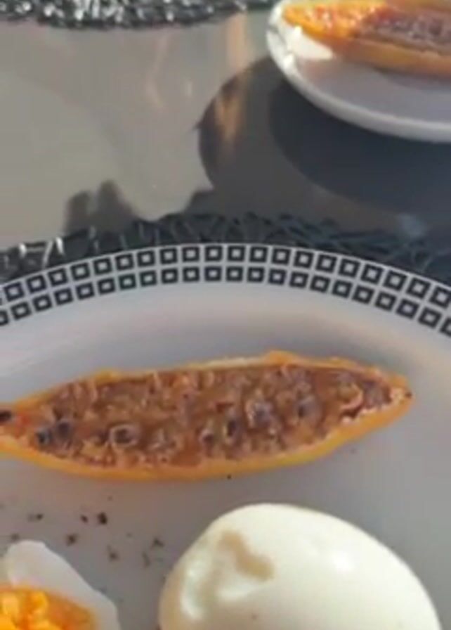 person eating breakfast on a sunny balcony. The breakfast consists of eggs and passion fruit halves. The person uses a fork to pick at the passion fruit, then smiles and covers their mouth with their hand. Other breakfast items on the table include a container of yogurt, a container of jam, and a beverage. The balcony overlooks the ocean, and there is a tall pine tree in the background.