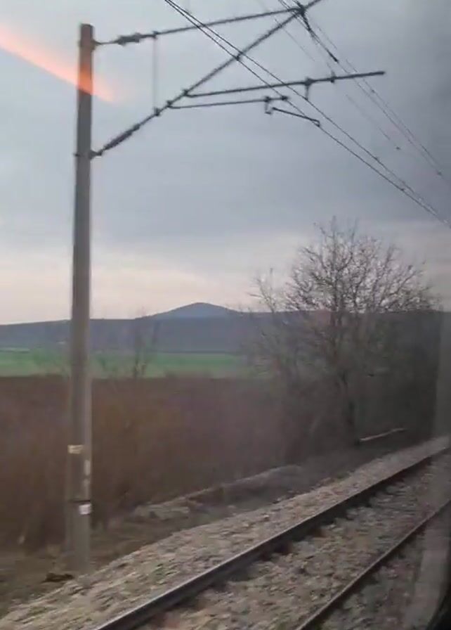view from inside a moving train, looking out of the window. Outside, the landscape consists of railway tracks, a low hedge, a bare tree, fields, and a distant hill under a cloudy sky with a hint of sunset. The overhead electrical wires for the train are also visible. The camera then pans upward to show the interior of the train carriage, which is mostly empty, with blue seating and an overhead compartment.
