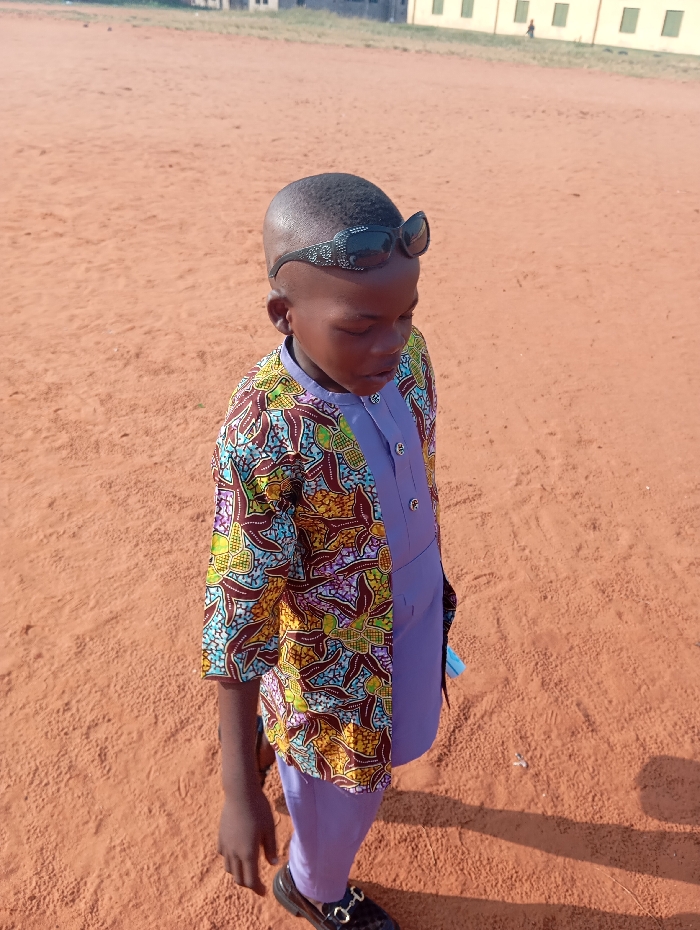 An image captured in Fegge, Nigeria, depicts a young, dark-skinned child standing on an unpaved, reddish-brown sandy ground under clear, bright sunlight. The child wears a light purple tunic and matching trousers, overlaid with a vibrantly patterned, multi-colored jacket featuring abstract and floral designs. Black sunglasses rest atop the child's closely cropped dark hair. Black loafer-style shoes with a gold-colored buckle are visible on the child's feet. The child's head is tilted downwards, and the gaze is directed towards the ground. In the distant background, a long, light-colored building with multiple rectangular windows is visible. The scene is static, with no apparent action or interaction beyond the child's posture.