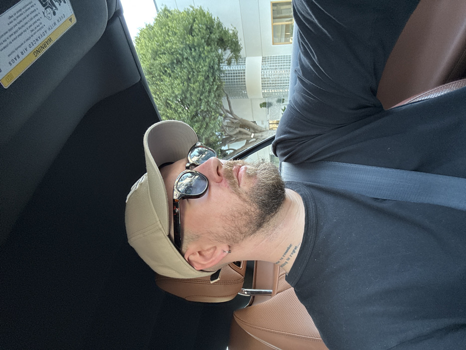 The image depicts an adult male seated in the driver's seat of a vehicle in Santa Monica, California, United States
