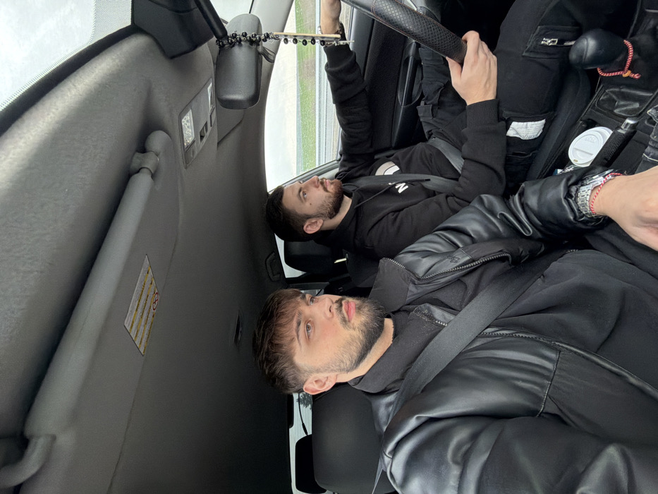 The image depicts the interior of a passenger vehicle in the city of Petrov Dol, Bulgaria. Two adult males occupy the front seats. The individual in the passenger seat, positioned on the left, has short brown hair and a trimmed beard, wearing a black puffer jacket over a black garment, and is secured by a seatbelt. A silver watch and a red-and-white string bracelet are visible on his left wrist. He is looking towards the front-right of the vehicle. The individual in the driver's seat, on the right, has short dark hair and a trimmed beard. He is wearing a black hoodie with a white "The North Face" logo and black cargo pants, secured by a seatbelt. His left hand is on the steering wheel, and his gaze is directed forward, concentrating on the road. A red-and-white string bracelet is tied to the laces of his black shoe on his right foot. The vehicle's interior features a gray headliner, a rearview mirror from which black rosary beads with a small wooden cross are suspended, and a center console holding two white disposable cups. An airbag warning label is affixed to the passenger-side sun visor. The exterior visible through the windows suggests an overcast day with a flat, open landscape alongside a road or highway, featuring a green verge and a guardrail.