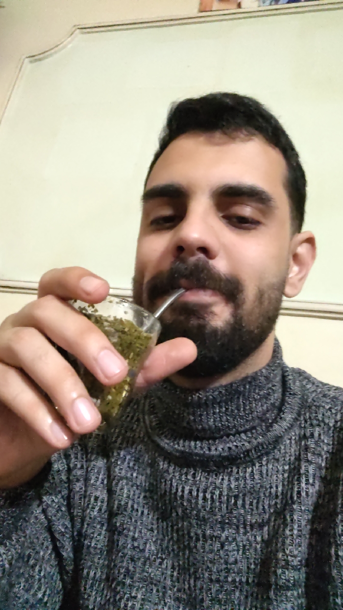 A close-up image depicts an adult male indoors in Al-Qaboun Municipality, Syria. The subject has dark hair, a dark beard, and dark eyebrows, and is wearing a dark grey knitted turtleneck sweater. He holds a clear glass with a green, granular substance, consistent with Yerba Mate, in his right hand. A metal straw (bombilla) is visible in his mouth, indicating consumption. The male subject is looking directly at the camera with a slight smile. The background consists of a light beige wall with an architectural trim visible in the upper left corner.