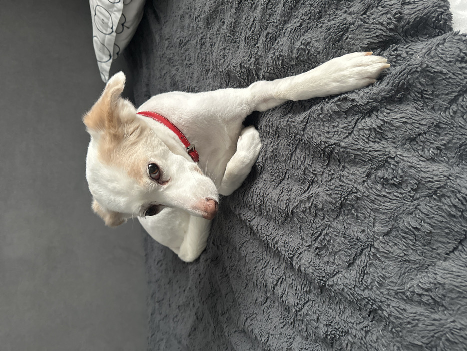 - "A white and tan short-haired canine, fitted with a red collar, is observed lying on a dark grey, textured blanket" by FM-qEm5e2, licensed under CC BY 4.0