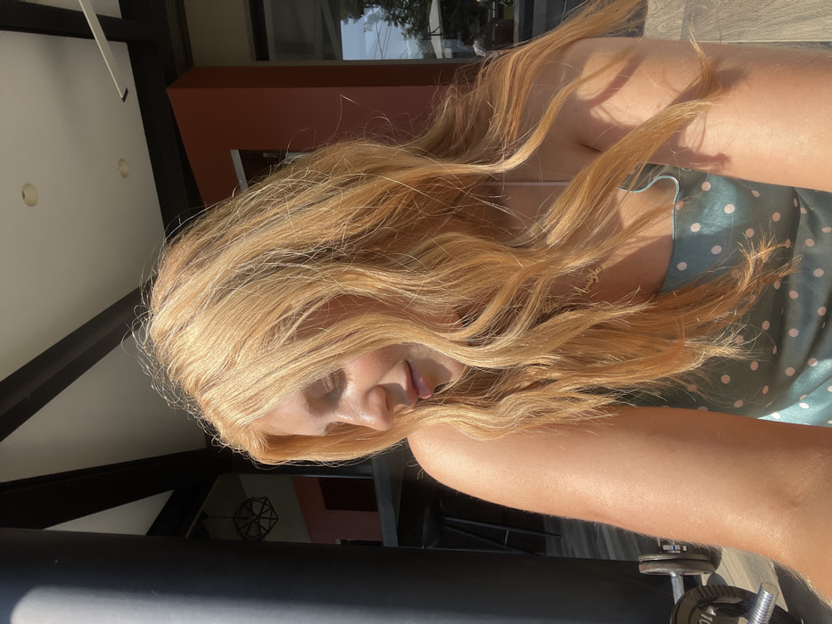 A light-skinned woman with long, blonde, wavy hair is seen from above, facing left