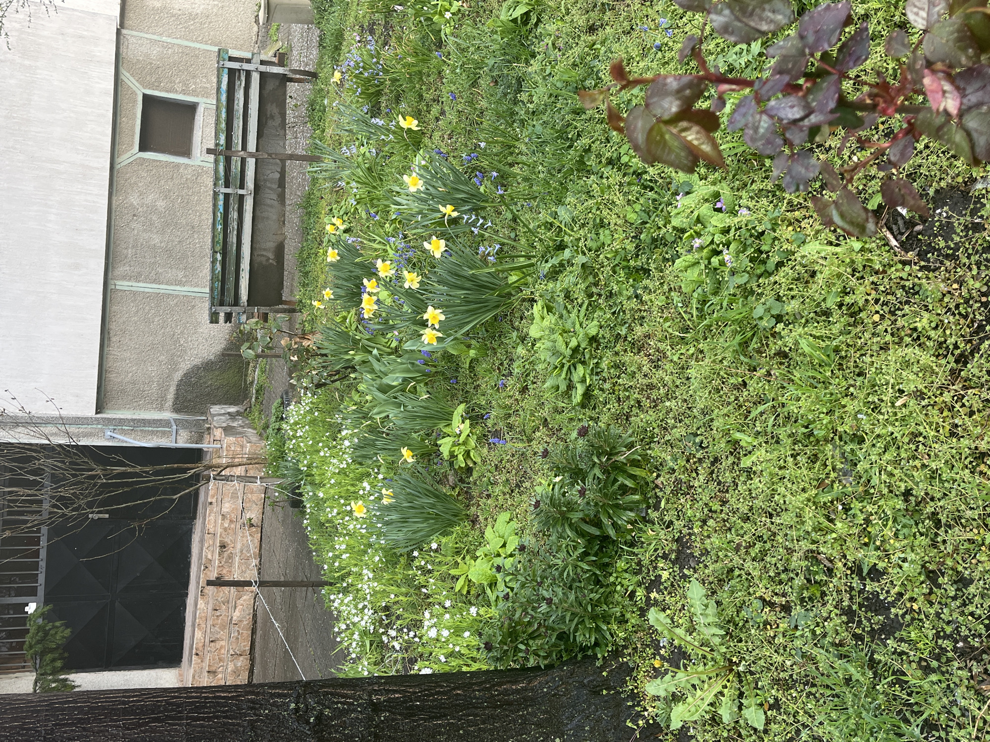 The image depicts an outdoor garden scene adjacent to a building in Sofia, Bulgaria, observed under overcast daylight conditions. In the foreground and midground, a vibrant garden plot is visible, characterized by dense green ground cover interspersed with multiple clusters of bright yellow daffodils (Narcissus) in various stages of bloom. Smaller white star-shaped flowers and sparse blue-violet blossoms (consistent with Muscari or similar species) are also distributed throughout the greenery. A thick, dark tree trunk occupies the left edge of the frame, partially obscuring the background. In the lower right, a young shrub with dark reddish-brown leaves is present. The background reveals a multi-story building. On the left, a large, dark, diamond-patterned metal gate or double door is situated at the top of a short flight of three light brown tiled steps. A slender, leafless tree stands adjacent to these steps. A simple barrier, consisting of white string strung between two thin dark posts, demarcates the garden from the paved area leading to the building entrance. The building wall above the gate is smooth and light-colored. Further to the right in the background, a weathered wooden bench with peeling green paint and a concrete base or planter is positioned against the building. The building facade behind the bench is textured, light-colored (likely concrete or stucco), featuring a distinctive light-green horizontal trim band and an irregularly angled, recessed window or vent. A light-colored cylindrical object, possibly a waste bin, is partially visible at the far right edge of the paved surface. No individuals or active events are depicted in the scene.