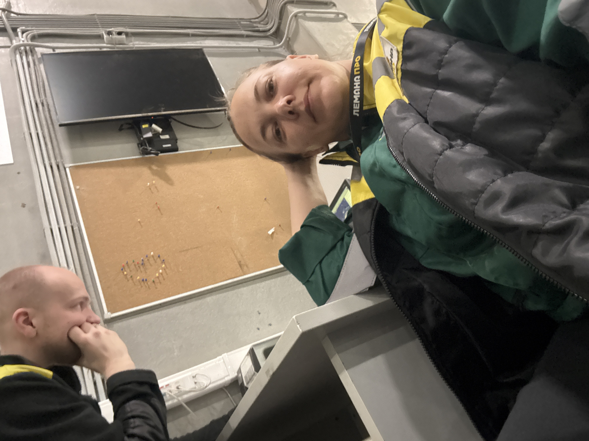 The image presents an indoor scene with two individuals. A person, identified as female, is positioned in the foreground, leaning their head on their hand. The person wears a jacket with visible "ЛЕМАНА ПРО" text on the straps, and a green and yellow design. To the left and slightly behind, a second person, identified as male, is visible, with their hand covering their mouth. In the background, a bulletin board with push pins arranged in a heart shape can be seen. Above the bulletin board is a monitor. The scene appears to be an office or work area, evidenced by the presence of the bulletin board, monitor, and what looks like a desk or shelf. Based on the text on the jacket, the location is identified as Lupanovo, Russia.