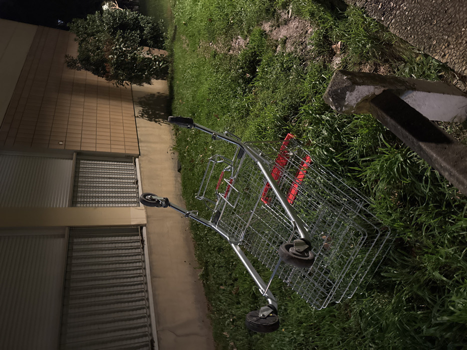 - "An abandoned silver and red shopping cart lies on its side in a grassy area beside a building" by FM-52BZY2, licensed under CC BY 4.0