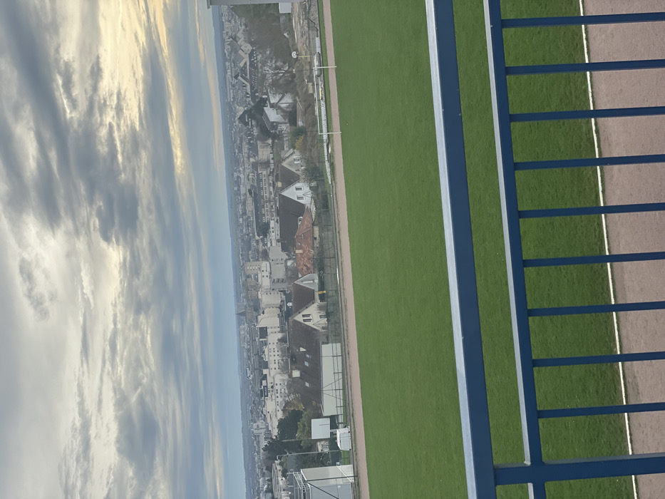 A cityscape stretches into the horizon beneath a cloudy sky. Rows of buildings with red-tiled roofs stand adjacent to a vibrant green field. A blue railing in the foreground provides a distinct boundary. The image is rotated, orienting the horizon vertically.