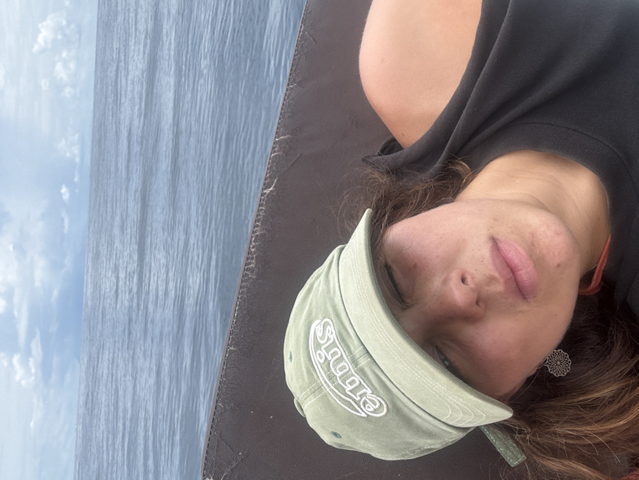 A female subject is depicted lying down on a dark brown, worn boat cushion or railing. She wears a light green baseball cap with white lettering, possibly "ebnis" or "ennis," and a black t-shirt, exposing her right shoulder and upper arm. Her head is tilted, and she looks towards the camera with partially closed eyes. A silver, circular, filigree earring is visible in her left ear. An orange strap or cord is present around her neck. The background features open, calm blue-grey ocean water under a cloudy sky with scattered white and grey formations. A distant landmass or island is faintly visible on the horizon. The scene is located on a boat in the waters surrounding Ban Ko Li Pe, Thailand.