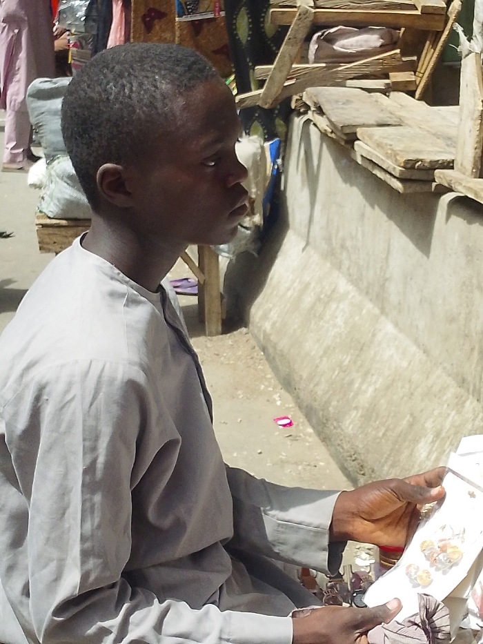 In Fagge D1, Nigeria, a young male with short dark hair and dark complexion is depicted in right profile, seated outdoors