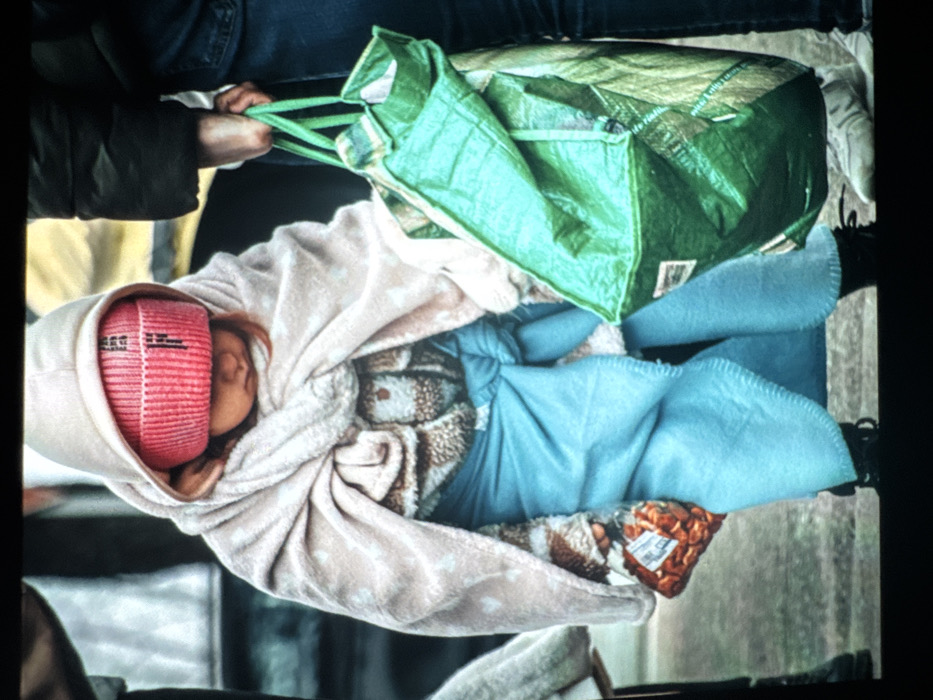 A forensic description of the scene in Kameno, Bulgaria, depicts a young child standing outdoors on a paved surface, heavily bundled against the elements. The child wears a bright pink ribbed knitted hat pulled low over the eyes, obscuring the face. A cream-colored blanket, patterned with faint hearts, is wrapped around the child's upper body over a light-colored hooded garment. A light blue blanket is tied around the child's lower torso. Dark-colored shoes are visible on the child's feet. The child holds a clear plastic bag containing numerous reddish-brown, elongated objects in the left hand. To the immediate right of the child, the lower body of an adult is visible, dressed in dark blue denim trousers and light-colored athletic shoes. This adult's right hand firmly grips the two fabric handles of a large, crinkled, shiny green reusable shopping bag. The background is indistinct and out of focus, indicating an outdoor setting with other figures vaguely present in the distance.