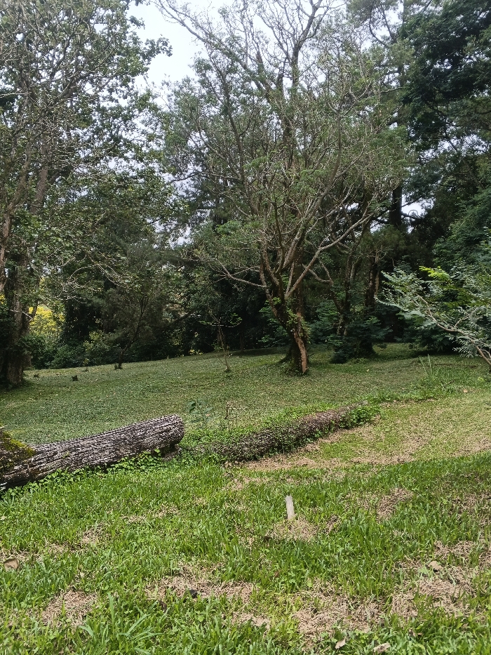 This image depicts an outdoor scene within the city of Kwekwe, Zimbabwe, characterized by a predominantly green and wooded environment. The foreground features a large, segmented fallen tree trunk lying horizontally across the lower third of the frame, partially covered by moss and small green plants. The ground is covered in green grass, exhibiting varying densities with some areas appearing lighter or sparser. A small, light-colored cylindrical object is embedded vertically in the grass towards the lower right. The mid-ground reveals a gently sloping grassy clearing, dotted with several trees of varying sizes and foliage densities. Some trees have visible trunks and branches, with lighter green leaves, while others appear darker and more densely covered. The background consists of a dense forest line, forming a dark green backdrop. The sky, visible through the tree canopy at the top of the image, is overcast and light grey. No human figures, animals, or man-made structures are visible within the scene. The overall impression is that of a natural or semi-natural park-like area.