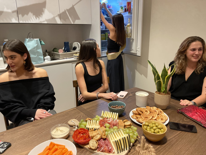 Four women are gathered in a kitchen around a wooden table laden with snacks: a charcuterie board, olives, nuts, carrot sticks, and pastries. Three women are seated; one is reaching into a refrigerator. All are dressed in black clothing. A potted snake plant is on the table, as are cell phones and a candle. Behind the seated women are kitchen counters, cabinets, and a shopping bag.