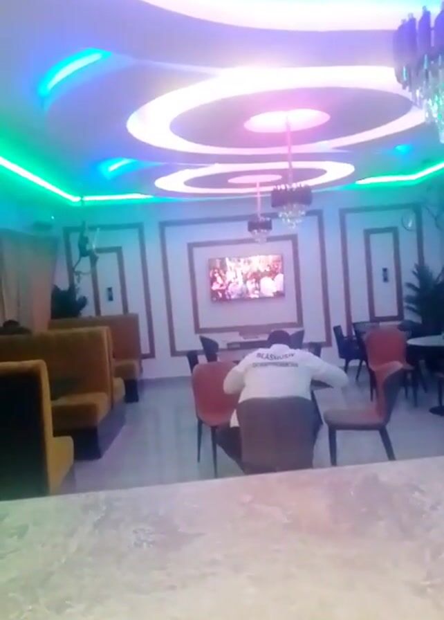 A room with a decorative ceiling is shown. The ceiling is white with concentric circles of blue, pink, and green light. A man wearing a white shirt with text on the back and brown pants is standing in the room. He is moving two red chairs together. The room has several tan booths and small tables with red chairs. A television is mounted on the wall, showing a group of people. There are decorative sconces on the walls and potted plants in the corners. A chandelier hangs from the ceiling. A counter is in the foreground. The camera is stationary.
