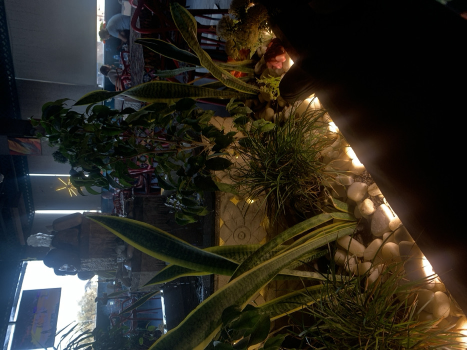 This image captures the interior of a cafe or restaurant located in Barza Municipality, Syria, during what appears to be evening hours. The foreground features a lush, illuminated planter containing various green plants, including prominent snake plants (Sansevieria trifasciata) with yellow-edged leaves and smaller grassy species. Warm, strip lighting embedded at the base of the planter casts an upward glow on smooth, light-colored pebbles and the vegetation. In the midground, a multi-tiered stone water fountain with cascading water and stacked rocks serves as a central decorative element, surrounded by additional green foliage, including a small tree-like plant. A decorative wall panel with a circular carved design is visible behind some of the plants. The background reveals a seating area with multiple tables and distinctive red chairs. At least two individuals are visible seated at tables; one in a light-colored shirt is seen in profile. A large window or opening to the left shows a bright, possibly overcast sky, and a television screen displaying colorful content. To the right, a yellow star-shaped light fixture adorns a dark pillar. The scene is predominantly lit by artificial, warm-toned lights, creating an inviting, low-light atmosphere.
