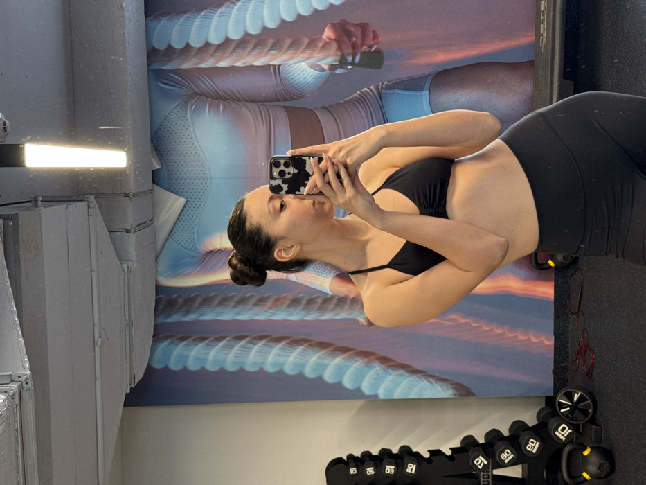 A female individual is captured in a mirror selfie within a gym setting in Sofia, Bulgaria