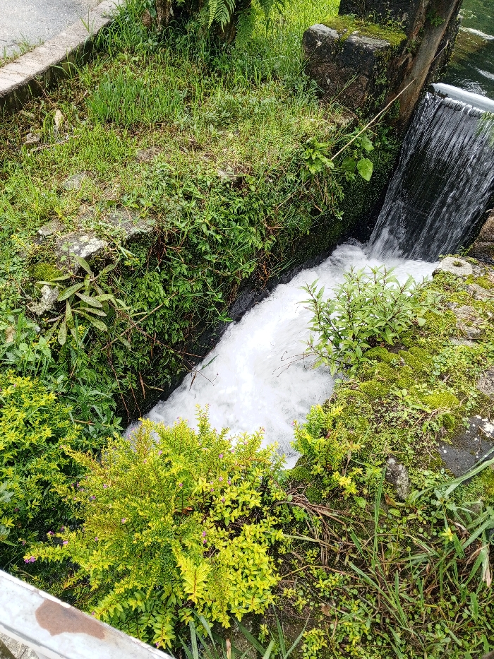 Water cascades down a small dam-like structure amidst lush greenery. Moss-covered stones line the edges, surrounded by various plants and grasses. A vibrant green bush with small purple flowers grows near the bottom. The rushing water appears white and frothy. Part of a gray railing is visible on the left side, adding a hint of human intervention to the natural scene.