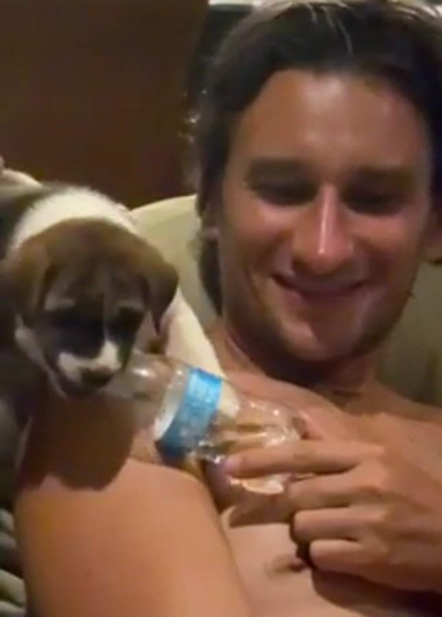 A man with a shirtless upper torso is seated on a couch holding a partially emptied plastic water bottle in his right hand. He is smiling slightly and addressing the camera. Perched on his left shoulder is a brown and white puppy, appearing small enough to fit comfortably. The puppy is preoccupied, gnawing on the water bottle's cap. In the background, indistinct objects are visible on a shelf or counter, including what appears to be various containers and bottles.