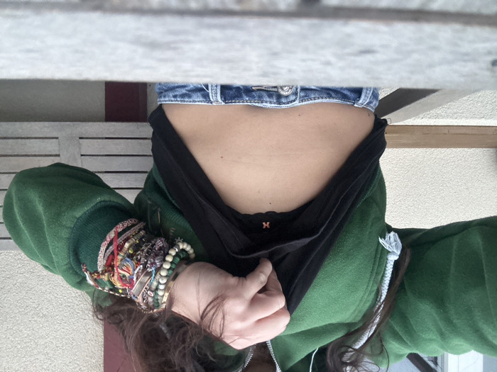 A young woman in a green hoodie and denim shorts displays her lower abdomen. She is wearing a black top underneath the hoodie. Her left wrist is adorned with numerous colorful bracelets. The perspective is from below, looking upwards. A wooden structure is partially visible at the top of the frame. The background features a light-colored wall and horizontal wooden planks.