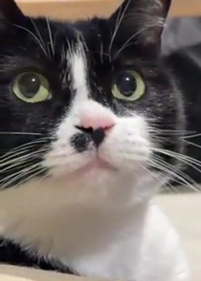 A close-up shot shows a black and white cat with green eyes