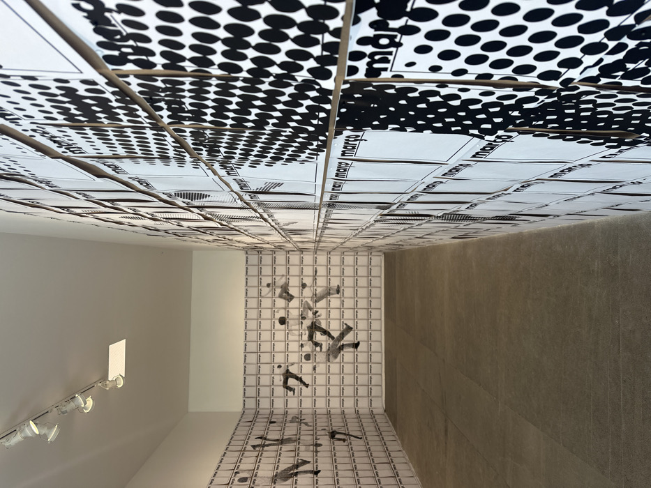 An exhibition space displays an immersive installation. The ceiling features black-and-white patterned panels, seemingly supported by wooden beams. One wall is plain white with track lighting, while the opposite wall is a light brown concrete. The far wall is covered in a grid pattern, with stylized figures in various poses creating an active scene, possibly of running. This grid and figure pattern likely continues to the floor.