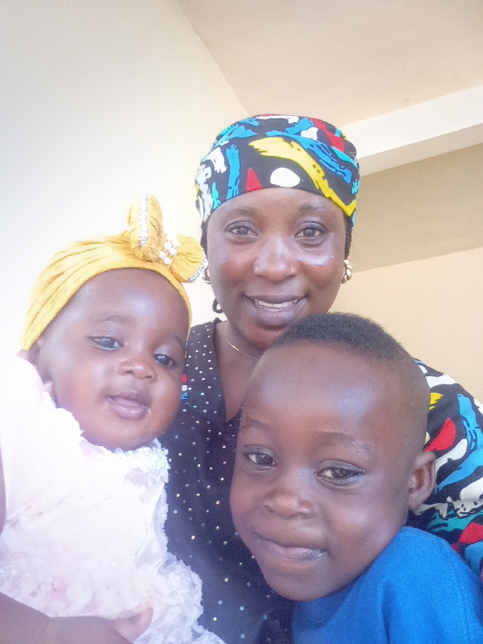 The image depicts three individuals in the city of Lafia, Nigeria, positioned for a close-up photograph. A dark-skinned adult female, smiling and looking directly into the camera, occupies the center. She wears a vibrant headwrap featuring multi-colored abstract patterns (blue, black, red, yellow, white) and a dark top with small white dots. Gold-colored hoop earrings and a thin gold necklace are visible. To her left, a dark-skinned infant, also smiling and looking at the camera, wears a yellow headwrap adorned with white beads and a light-colored dress with lace and pearl embellishments. To the adult female's right, a dark-skinned toddler, smiling and looking at the camera, wears a blue top and has short, dark hair. The three individuals are arranged in a familial grouping, with the adult appearing to hold the infant and the toddler positioned nearby. The background is a plain, light-colored wall, indicating an indoor or shaded outdoor setting with bright, even illumination.