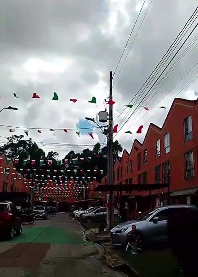 residential street lined with red-brick buildings, decorated with red, white, and green flags strung across the street