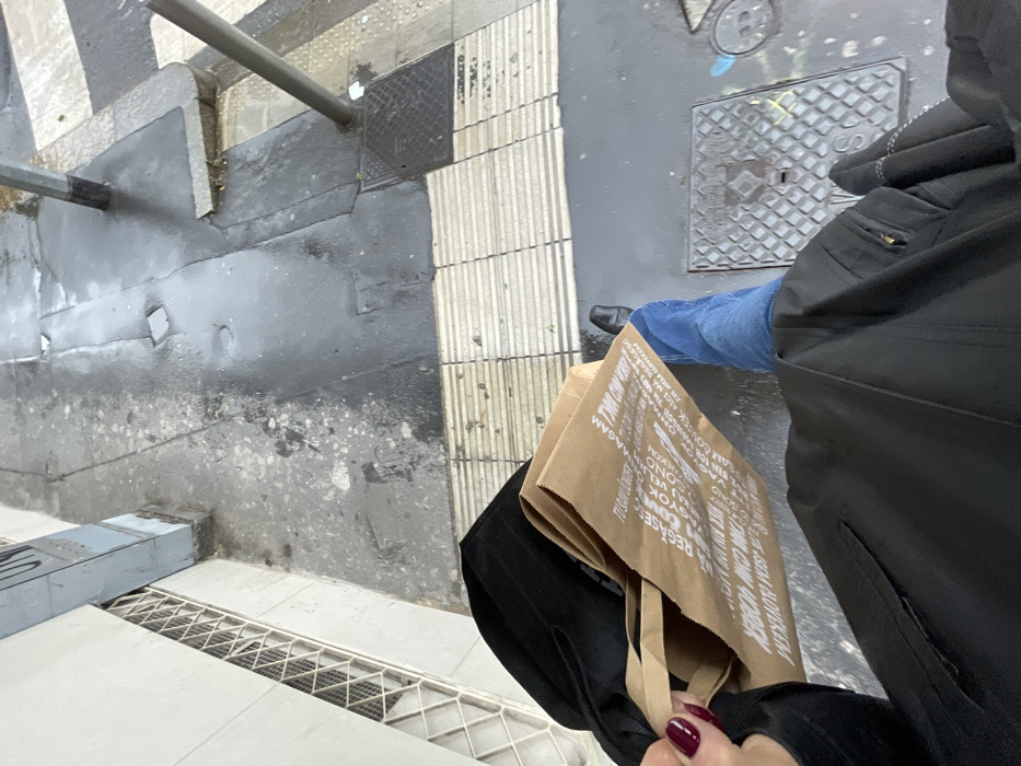 person standing on a sidewalk in Milan, Italy (latitude: 45.481, longitude: 9.198). The person is wearing a black jacket, blue jeans, and black shoes. The person is holding a brown paper bag in their right hand. The sidewalk is wet, and there is a metal grate in the middle of the street. There is a light pole on the right side of the image. The building on the left side of the image is made of white concrete and has a large window. The sidewalk is made of concrete tiles and there is a white line painted on the street. The person is standing near the edge of the sidewalk, facing the street. The person is looking down at the paper bag.
