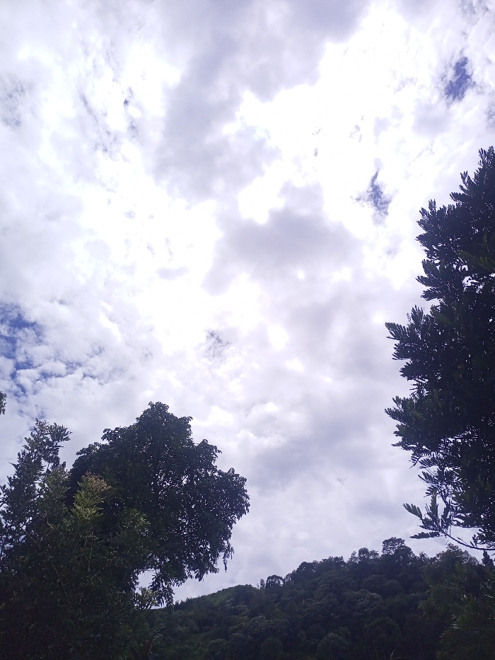 Overcast sky dominates the scene, with bright white and grey clouds filling most of the frame. Dark green trees frame the sides and bottom of the image. A small, tree-covered hill rises in the lower-center of the view. Foliage ranges from lush and dense to sparse and wispy, suggesting a variety of plant life. Overall, a natural, slightly gloomy outdoor setting.
